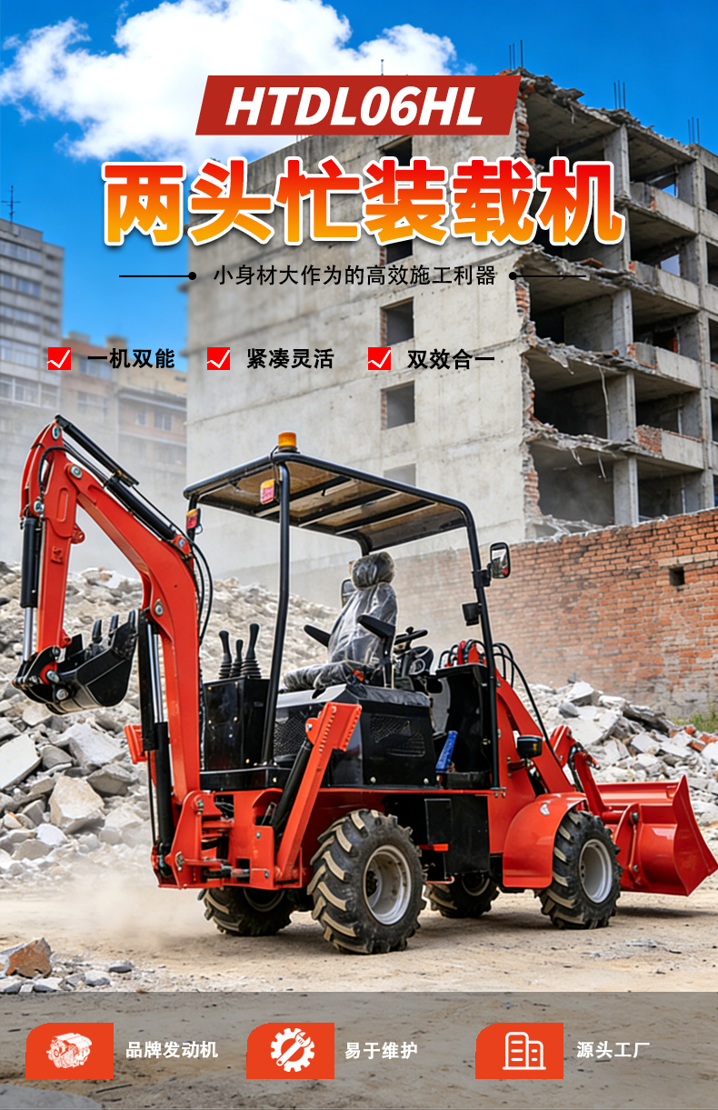 HTDL06HL反铲装载机紧凑灵活:小巧机身 + 小转弯半径,狭窄场地自由穿梭,转场作业更便捷