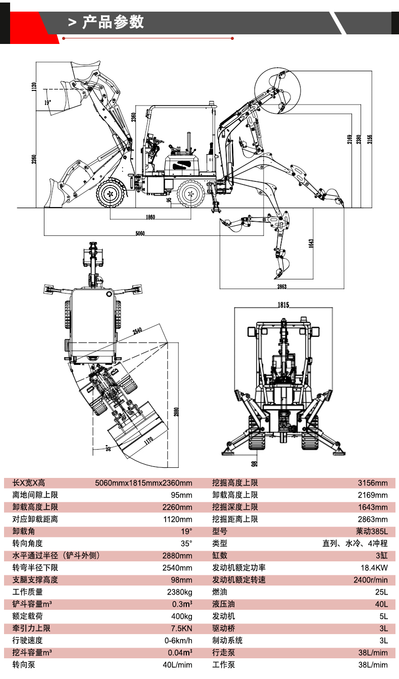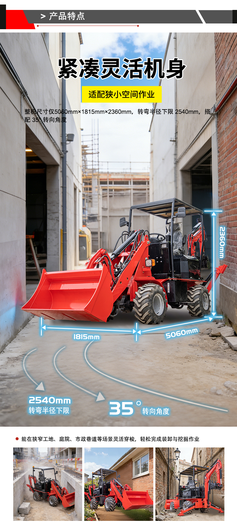 整机尺寸仅5060mm×1815mm×2360mm,最小转弯半径 2540mm,搭配 35° 转向角度,能在狭窄工地、庭院、市政巷道等场景灵活穿梭,轻松完成装卸与挖掘作业。