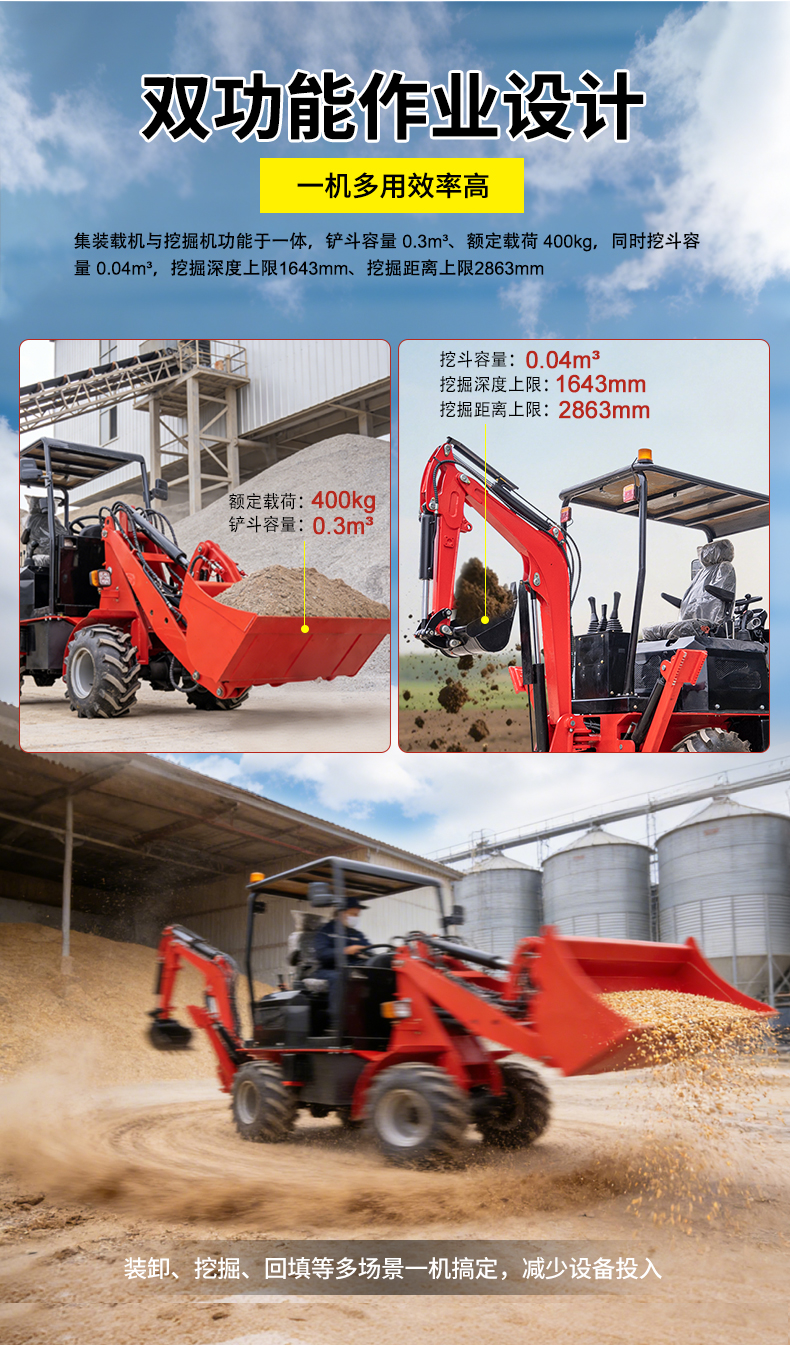 集装载机与挖掘机功能于一体,铲斗容量 0.3m³、额定载荷 400kg,同时挖斗容量 0.04m³,最大挖掘深度 1643mm、挖掘距离 2863mm,装卸、挖掘、回填等多场景一机搞定,减少设备投入。