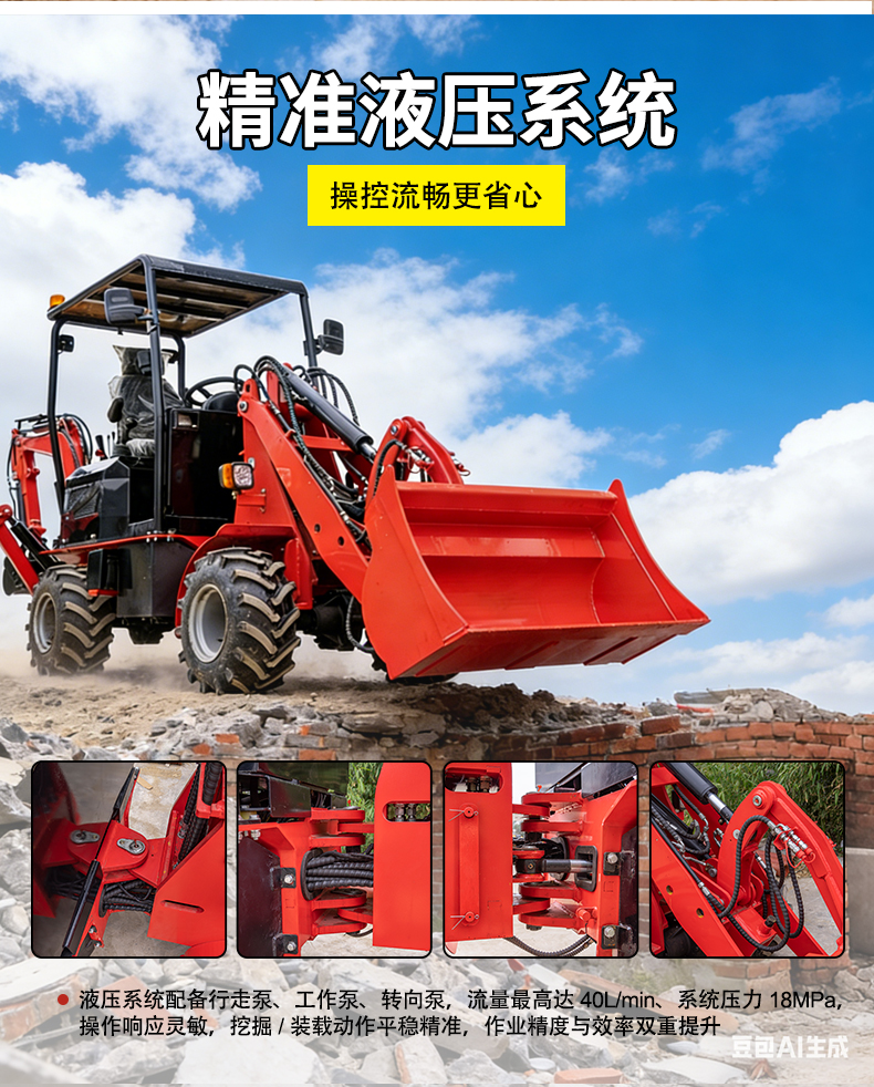 液压系统配备行走泵、工作泵、转向泵,流量最高达 40L/min、系统压力 18MPa,操作响应灵敏,挖掘 / 装载动作平稳精准,作业精度与效率双重提升。