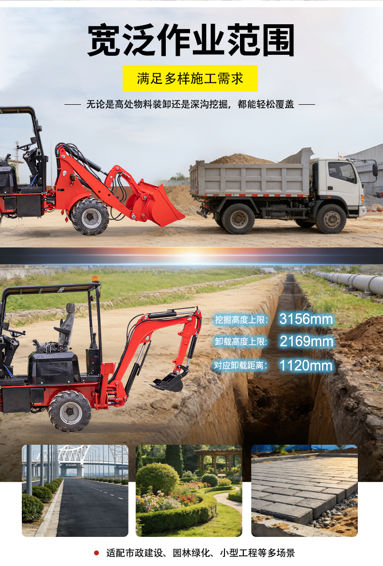 最大挖掘高度 3156mm、最大卸载高度 2169mm,对应卸载距离 1120mm,无论是高处物料装卸还是深沟挖掘,都能轻松覆盖,适配市政建设、园林绿化、小型工程等多场景。